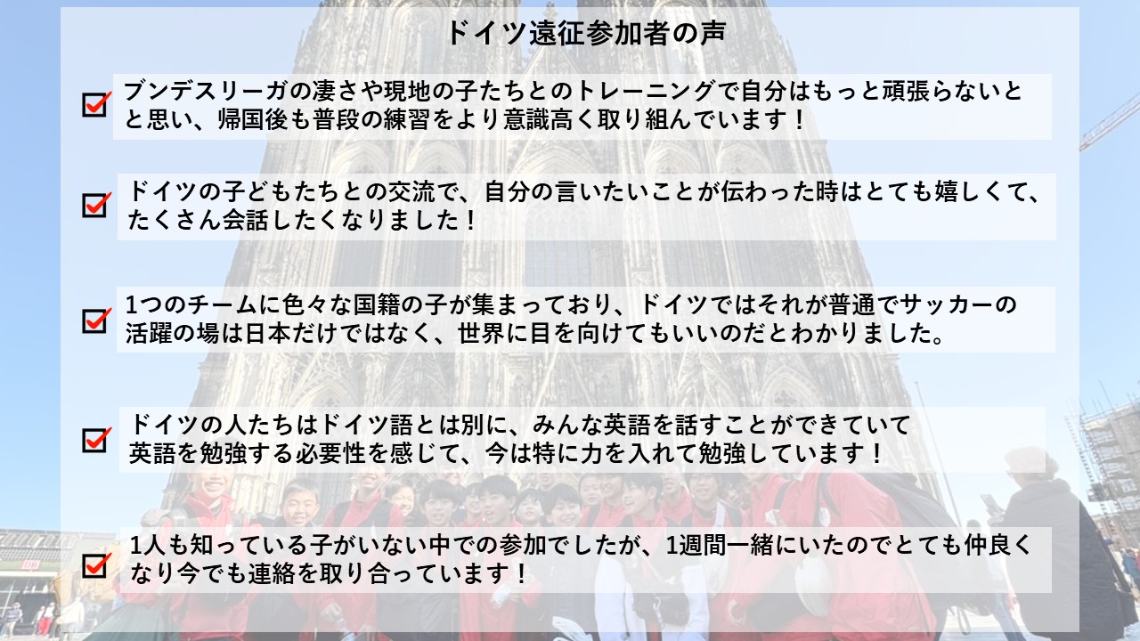 普段のスクール活動や自チームのトレーニング等で習得してきたことを試す場となり、実際にドイツの選手たちとプレーすることで、ヨーロッパの同じ年代の選手たちがどれくらいの強度で、どのようなトレーニングを日々取り組んでいるのかを体感しにいきます。
